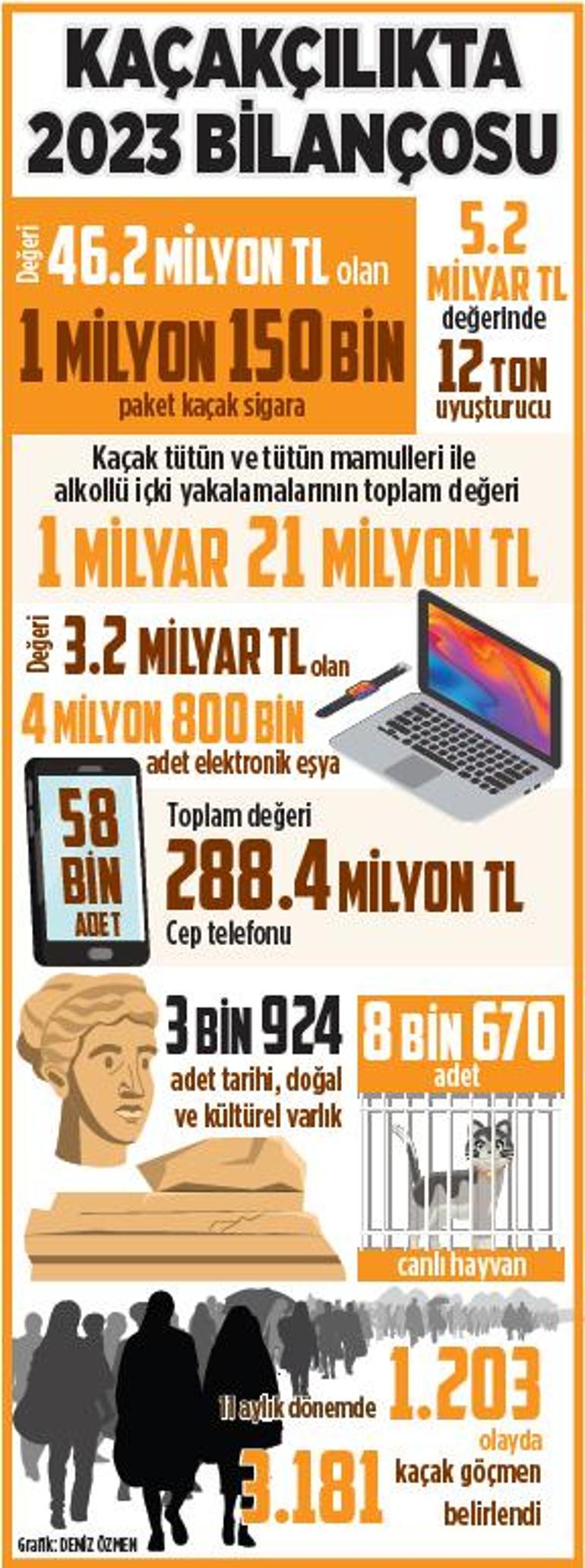 Mithat Yurdakul – ANKARA – Sınır kapıları ve limanlarda kaçakçılıkla mücadelede 2023 yılına ait veriler belli oldu. Geçen yıl kaçak tütün, sigara, tütün ürünleri ile alkollü içki yakalamalarının toplam değeri 1 milyar 21 milyon TL’yi bulurken, yaklaşık 800 milyon TL’lik vergi kaybı ortaya çıktı. Geçen yıl 58 bin adedi cep telefonu olmak üzere; 3.2 milyar TL değerinde 4 milyon 800 bin adet kaçak elektronik eşya yakalanırken, 5.2 milyar TL değerinde yaklaşık 12 ton uyuşturucu madde ele geçirildi.